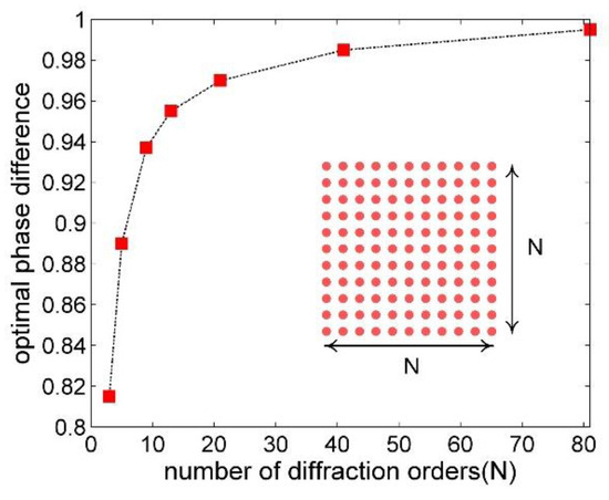 In Figure 3, we find that as the number of diffraction orders contained in the target pattern increased, the optimal phase difference moved toward π gradually. In order to verify this speculation, we chose the square pattern consisting of N × N orders as the target light field, as shown in the inset of Figure 6, and performed the non 0-π DOE design. The obtained optimal phase difference under different numbers of diffraction orders N is plotted in Figure 6. It can be seen that as N increased from 3 to 11, the optimal phase difference increased rapidly from 0.8π to 0.955π. Thereafter, with the increase of N, the optimal phase difference increased slowly. When N was equal to 81, the optimal phase difference reached 0.995π. From the variation law of the curve, we can conclude that when a target light field contains a small number of diffraction orders, a non 0-π DOE design can be considered to improve the diffraction efficiency. Conversely, when the target light field contains a large number of diffraction orders, it is recommended to design the traditional 0-π DOE.