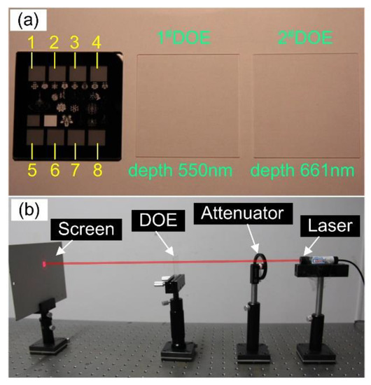 To further validate the proposed method, non 0-π DOEs for generating various diffraction orders distributions were fabricated and optically characterized. The lithography and reactive ion etching technique were adopted to create binary relief structures on the fused silica substrate. More detailed process flow can be found in [29]. Figure 7a shows the 2.5-inch mask and the fabricated two DOEs with etching depth of 550 and 661 nm. To simplify processing, eight phase distributions for the generation of eight different diffraction patterns were drawn on the same mask, represented by the number from 1 to 8 in the figure. Each had the same sampling interval of 1 × 1 μm, period of 129 × 129 μm, and total area of 1 × 1 cm. Figure 7b shows the optical configuration used to test the performance of the fabricated DOEs. A monochromatic laser with a wavelength of 650 nm irradiated the DOE vertically, thus forming a far-field diffraction pattern on the white screen, which was then captured by the Cannon camera. The attenuator was used to adjust the intensity of the laser.