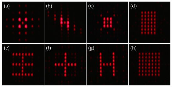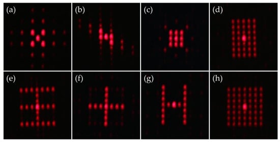 Figure 8 shows the captured diffraction patterns of the 1# DOE with etching depth of 550 nm. It can be seen that light intensity of the zero order in Figure 8a–c was similar to that of other orders and the patterns were well reconstructed. However, the zero order was significantly brighter than other orders in Figure 8d–h. This difference was due to the fact that for the eight target patterns, the optimal phase difference of the designed non 0-π DOEs were not equal, and are 0.755π, 0.755π, 0.815π, 0.905π, 0.889π, 0.854π, 0.87π, and 0.92π, respectively. For the binary phase DOE with phase difference φ, the theoretical etching depth was determined by d = λφ/(2(n − 1)). Here the refractive index of the fused silica was n = 1.4565 at the wavelength of λ = 650 nm. Then, the corresponding theoretical etching depths of the eight patterns were 537 nm, 537 nm, 580 nm, 644 nm, 633 nm, 608 nm, 619 nm, and 655 nm, respectively. Since the depth 550 nm of the 1# DOE was similar to the target values of the patterns in Figure 8a–c, the reconstructed light fields were uniform. While for the patterns in Figure 8d–h, the depth was smaller than the theoretical depth. Therefore, the zero-order was stronger than other orders. Figure 9 shows the captured diffraction patterns of the 2# DOE with etching depth of 661 nm. We can see that in this case the patterns in the Figure 8d–h were well reconstructed. For the patterns in Figure 9a–c, since the depth was much greater than the theoretical depth, the zero-order light was significantly weaker than the other orders. The experimental results are in good agreement with the numerical simulation, which showed that the proposed method is effective for non 0-π DOE design.