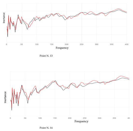 Numerical (black line) and experimental (red line) inertances vs. frequency (Hz) for the shelter component at points N. 13 and 14 (see Figure 4).