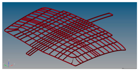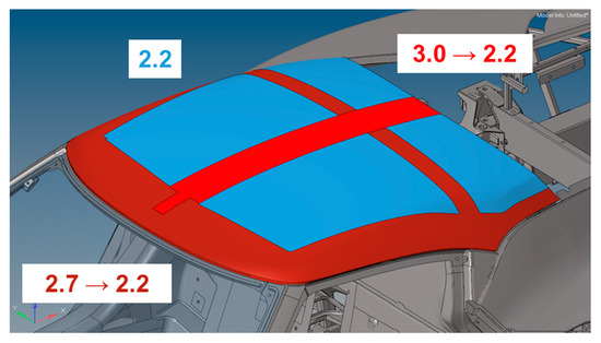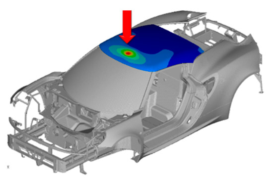 A mere switch to the new material, with no changes in the geometry/structure of the car roof, would not have preserved the values of static rigidity, dynamic rigidity, and the configuration of modal shapes of the fiberglass car roof. For this reason, a geometric/structural optimization of the component was necessary.