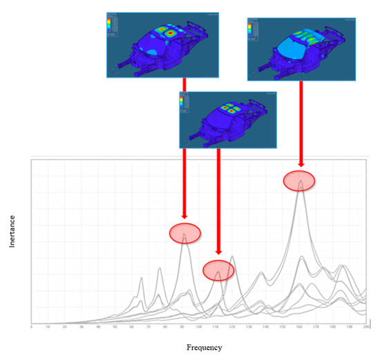Once the new geometry/structure was defined, a vibroacoustic analysis was carried out, consisting of the following phases: The fluid cavity of the passenger compartment, the seats, and the dashboard of the vehicle were modeled with the ANSA software (a multidisciplinary CAE pre-processing tool that provides all the necessary functionality for full-model build up, from CAD data to ready-to-run solver input file), then a modal analysis was carried out to check any coupling of the fluid cavity modes with the structure car body modes, in order to decide if a weak rather than a strong coupled analysis was needed. Finally, the vibroacoustic transfer functions to the driver’s ear node were assessed considering two different excitation points on the structure.