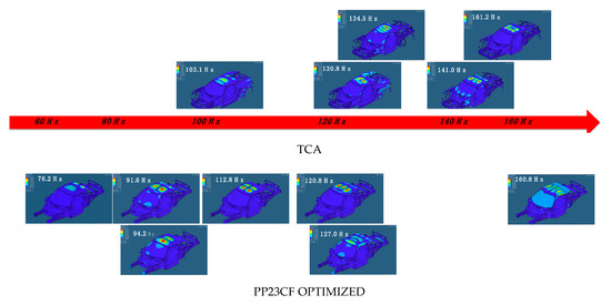 The PP23CF pavilion presents two structural modes at low frequencies, up to the frequency of 80 Hz. However, the absence of cavity modes in the frequency range 0–80 Hz and the high damping level provided by the new material should protect against very significant in-cabin sound pressure increases.