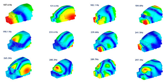 After having discretized the cavity, a FEM modal analysis was carried out to find out the cavity modes (Figure 23). The analysis was carried out with the Nastran SOL 103 in the frequency range 0–900 Hz. From Figure 23, it is possible to highlight a first longitudinal mode at 107.6 Hz and a second transversal mode at 131.6 Hz, then a mixed local (involving the anterior part of the cavity transversely)-global (involving in an oblique direction the remaining part of the cavity) mode at 182.1 Hz, etc. (increasing the frequency, the modes assume a more complex shape and, on the other hand, progressively become of reduced interest for our purposes).