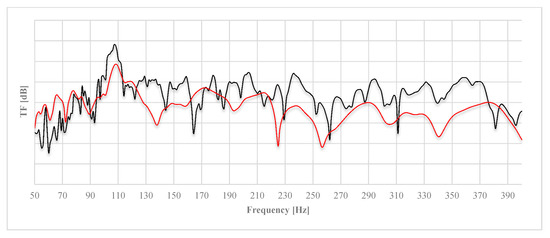 Vibroacoustic transfer functions (TF) from the shock absorber attachment to the ear node (MIC 2)—contribution of all panels, for pavilion made of TCA (black line) and PP23CF OPTIMIZED (red line).