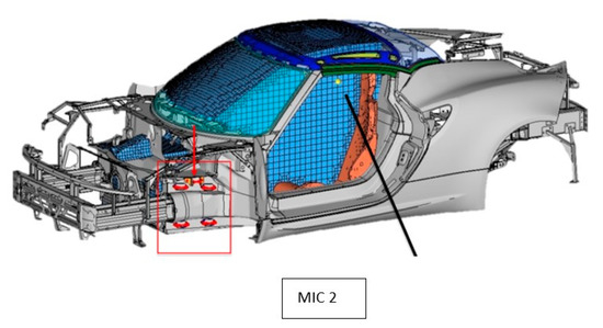 Force input at front shock absorber connection (in red) and measurement point for sound pressure level (MIC 2).