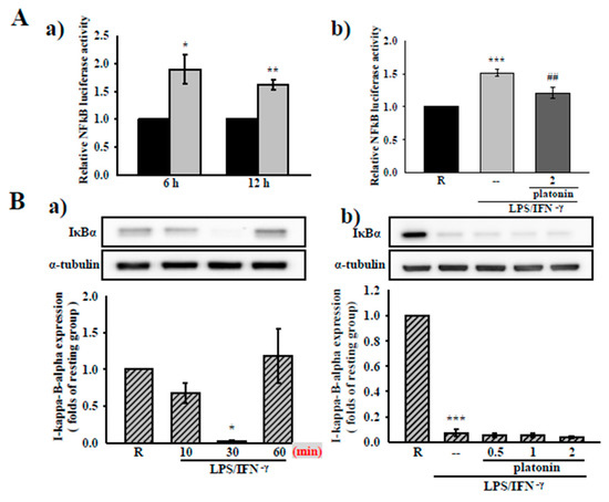 Effects of platonin on the Nuclear factor kappa-light-chain-enhancer of activated B cells (NF-κB) signaling pathway in vascular smooth muscle cells (VSMCs) stimulated by LPS/IFN-γ. (A) After transient transfection with NF-κB-luc and Renilla-luc plasmids for 24 h, the VSMCs were administered without (a) or with (b) platonin (2 μM) for 30 min then stimulated by the combination of LPS (50 μg/mL) and IFN-γ (100 units/mL; LPS/IFN-γ) for 6 h or 12 h (black bar: resting group; gray bar: LPS/IFN-γ-treated group; deep-gray bar: platonin + LPS/IFN-γ-treated group). A luciferase assay was conducted as described in “Materials and Methods.” (B) (a) Cells were treated with LPS/IFN-γ for the indicated period. (b) Cells were pretreated with platonin (0.5–2 μM) for 30 min before treatment with LPS/IFN-γ for another 30 min. (C) Cells were pretreated without (a) or with platonin (1 μM or 2 μM) (b) or okadaic acid (10 nM) + platonin (2 μM) (c) for 30 min, then treated with LPS/IFN-γ for the indicated time (a), 30 min (b), and 24 h (c). The extent of IκBα phosphorylated p65, and inducible nitric oxide synthetase (iNOS) were determined using Western blotting assay. Data are represented as mean ± S.E.M. (n = 3); * p < 0.05, ** p < 0.01, *** p < 0.001 compared with the resting (R) group; # p < 0.05, ## p < 0.01 compared with the positive control group.