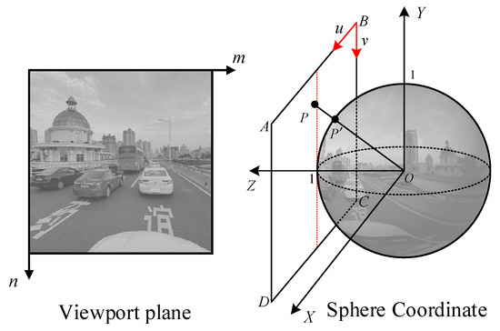 Figure 2 shows the viewport rendering procedure for the given 360° image, where the coordinates of the pixels in the viewport picture (VP) and UV plane (a rectangular ) are denoted by and , respectively. The pixel values in the VP depend on several variables, including the FOV, the horizontal and vertical resolutions of the VP, and the projection technique. The procedure to calculate a pixel value of in the VP is equivalent to getting the value of pixel at the corresponding location in the 3D sphere image. Therefore, this procedure consists of three steps: (step 1) the derivation of the coordinate , which is mapped to ; (step 2) calculation of the corresponding location of on the unit sphere for the that was calculated in (step 1); (step 3) obtaining the pixel value at . The first and second steps are represented by two functions and , respectively, as follows:
