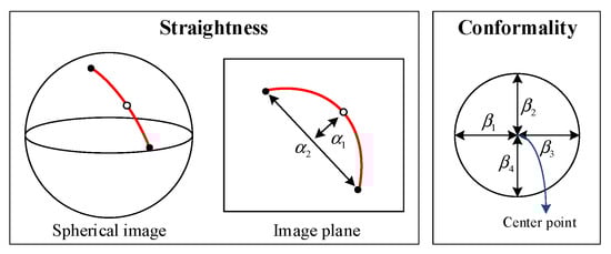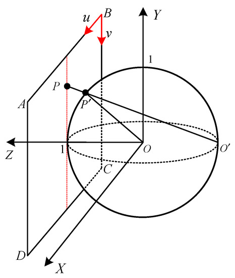 Figure 4 shows the UV plane and sphere when the stereographic projection [33] is used, where point is projected onto along the straight line between and , whereas the line between and is used in the perspective projection [33].