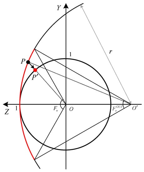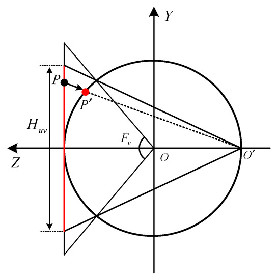 In Figure 10, the red curve represents the cross-section of the proposed UV surface, where is the vertical FOV and is the corresponding vertical angle at the center of the outer sphere to cover the surface that is generated by applying at the center of the unit sphere. The relationship between and is as follows:
