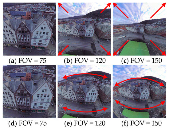 The subjective qualities of the viewports that are generated with various FOVs are compared in Figure 6, where (a–c) and (d–f) show the perspective [33] and stereographic [33] projections, respectively. As observed in Figure 6, when the perspective projection is used, the viewport shows a distorted perspective for a wide FOV. On the other hand, when the stereographic projection is used, straight lines are severely bent as the FOV increases.