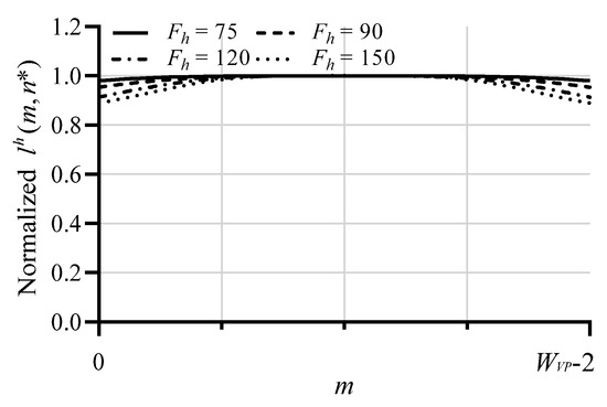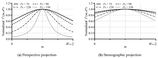 where , , and are the specific values that are used to calculate the lengths of the arcs between the horizontal and vertical positions. Figure 8 presents the normalized values of according to the horizontal FOV () when the perspective and stereographic projections are used. In this figure, we can observe that the length between the locations of the consecutive sampling points on the sphere decreases as moves away from the center (). This means that the pixels in the boundary region of a VP are made by sampling the points with reduced sampling intervals on the sphere. This makes the pixels in the VP look like a stretched form of points on the sphere. This tendency is more significant as increases. As observed in Figure 8a,b, the amount of stretching in the perspective projection is greater than that in the stereographic projection. Note that the analysis for is similar to those in Figure 8, although it is not presented in this paper.