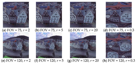Figure 11 displays the VPs that occur from applying the curved UV surface for the FOV = {75, 120} and = {2, 5, 20, 0.3}, where a larger outer sphere produces flatter straight lines. When is set to 0.3, the generated viewports degrade significantly, because = 0.3 is included in the range of instability in Equation (31).