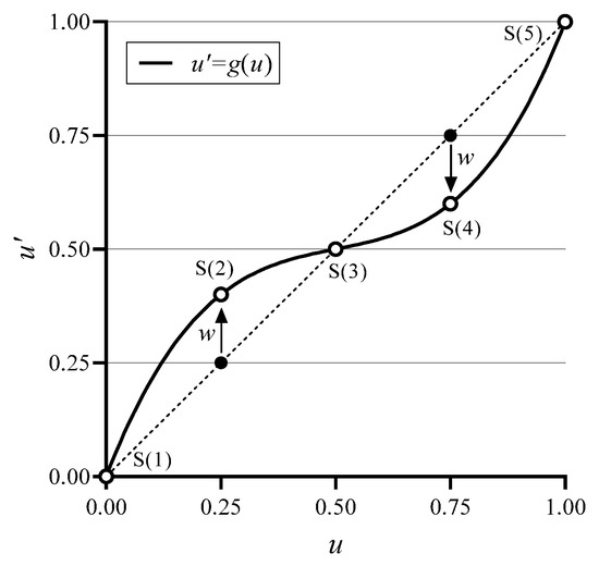 In this section, we adjust the sampling intervals that are made by using the curved UV surface so that the sampling positions are more evenly spaced. Figure 12 presents a mapping function between the original index and the modified index on the UV plane, where the function passes through {S(1), S(3), S(5)} on the diagonal line and {S(2), S(4)}, which are not on the diagonal line. {S(1), S(2), S(3), S(4), S(5)} are ancillary parameters that are used to explain the mapping function. The quantity of the deviation of {S(2), S(4)} from the diagonal line is set to , which is defined as follows:
