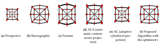 Distortions resulting from the perspective projection [33] (a–c) and stereographic projection [33] (d–f).