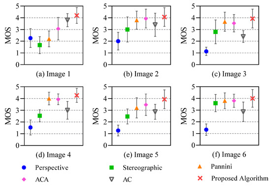 To provide simulation results for the perceptual evaluation, the single stimulus method of BT.500 [36] is used for the images in Figure 19. The mean opinion score (MOS) is a simple measurement to obtain the viewers’ opinions. The MOS provides a numerical indication of the quality that is perceived by the viewers. The MOS is expressed as a single number in the range of 1–5, where 1 means bad and 5 means excellent. In this test, the viewport images with a wide FOV were evaluated and they were scored by 20 viewers who were graduate students. Figure 19 shows the MOS values. The MOS values of the proposed method are always much higher than those of the conventional methods [25,27,31,33].