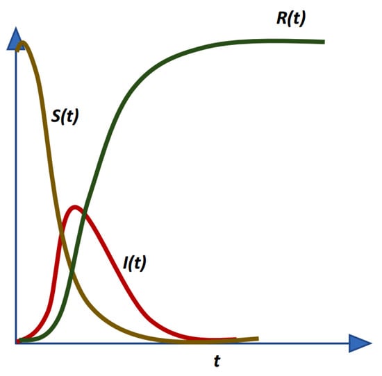 Despite the development of various extensions of the SIR model, the standard SIR model remains the preferred first approach for analyzing the spreading of an infectious disease (especially in the beginning or first phase) and it is reasonably predictive [11]. The SIR model splits a given population N into three compartments (non-intersecting classes) at any given time t (measured in days) namely, (i) susceptible (not yet infectious and disease free individuals at t) denoted , (ii) infectious (confirmed or isolated individuals) denoted , and (iii) removed (no longer infectious or dead) denoted . The number of individuals in each compartment vary over time. In general, the dynamics is described with a large number of susceptible individuals at the beginning, since the entire population that is not infected is considered to be susceptible, while infectious individuals remain low at the beginning of a pandemic. At subsequent times, the number of infectious individuals will increase, the number of removed individuals will begin to gradually increase, and the number of susceptible individuals will decrease. Finally, towards the end of a pandemic, the number of removed individuals will increase, the number of infectious individuals will decrease gradually, while the number of susceptible individuals will remain the lowest. The disease dynamics according to SIR model can be visualized, as in Figure 1. The variation rate over time in each compartment is modeled using a system of non-linear ordinary differential equations (ODEs),