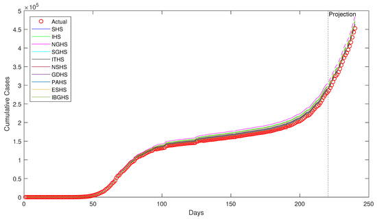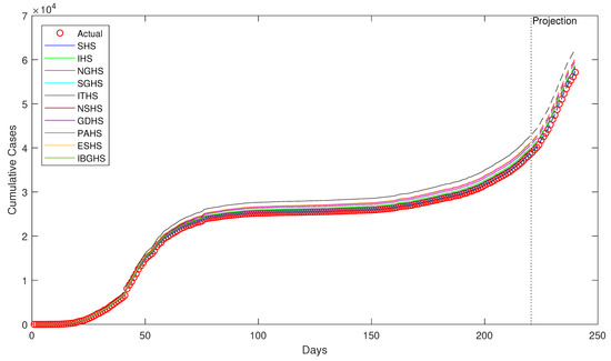 For the IR data set, it is observed that the simulations are reasonably close to the observed cumulative cases, except for ITHS. This shows that most of the simulations managed to mimic the observed trend well. Excluding ITHS, we can group the algorithms with similar simulations as (i) ESHS, NGHS, and GDHS; (ii) IHS, IBGHS, and SHS; and, (iii) SGHS, PAHS, and NSHS. Note that the difference in the simulation of ITHS was better in the previous three data sets, but it appeared to be the worst in this data set. The combination of algorithms that produced similar simulations is also different from combinations in previous data set, notably the FR data set.
