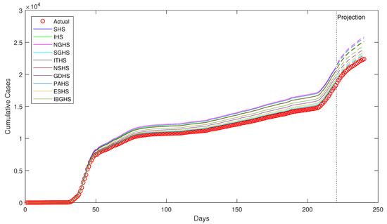 Table 7 provides the optimized epidemiological parameters and the corresponding fitness values (average from 10 independent runs) for the SG data set. Figure 6 displays the visualization of the 220 days simulation, together with the 20 days projected simulation using the optimized parameters. The simulations are distinguishable, thus the visualization is informative, except for a slight overlap between ITHS and IBGHS. The simulations band begin to diverge from the observed cumulative cases approximately around the hundredth day of the outbreak, except for the simulations of ESHS, PAHS, and IHS, which diverged gradually. While other simulations deviated from the rest, ESHS, PAHS, and IHS were close to each other until day 200 of the outbreak. Only after that, the simulations diverged from each other in a small amount up to the projection period. All of the simulations were far from the observed values, resembling a similarity with the case of simulations in the SK data set. The projected simulation for subsequent 20 days indicated an even larger deviation of the simulations from the observed values. It is observed from the fitness values (SSE) presented in Table 7 that IHS appears to best performing estimator for SG data set, while ITHS is the least performing estimator, similar to IR data set.