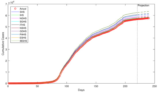 For the SG data set, it is observed that the simulations are quite far off the actual cumulative cases, with ITHS being the farthest and IHS being the nearest. Nevertheless, IHS’s simulation is still far off the observed cumulative cases. The simulations were not able to resemble the observed trend well and it is undoubtedly not as good as for USA, FR, and IR data sets. The quality of simulations are similar to the SK data set. The simulations of ITHS and IBGHS are really far off the observed values. We note that the simulations of ITHS and IBGHS are similar, NSHS and SGHS are close to each other, GDHS and NGHS are approximately close, ESHS and PAHS are close to each other, while SHS and IHS were not similar or close to the rest.