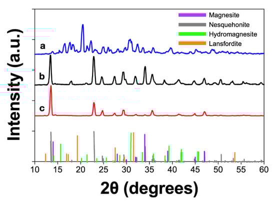 Different MgCO3 structures were obtained, including hydromagnesite (Mg₅(CO₃)₄(OH)₂·4H₂O), dypingite (Mg5(CO3)4(OH)2·5H2O), lansfordite (MgCO3·5H2O), magnesite (MgCO3), and nesquehonite (MgCO3·3H2O) according to XRD analysis. The density of these hydrated magnesium carbonates depends on their structure, hydromagnesite usually is 2–2.5 times denser than dypingite [], therefore, it would present less specific surface area.
