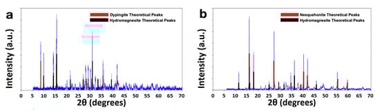 X-ray diffraction patterns (blue lines) of (a) magnesium carbonate, from aqueous route synthesis with nitrate as precursor, showing a mixture of dypingite and hydromagnesite, according to Rietveld refinement. (b) Magnesium carbonate, from aqueous route synthesis with sulfate as precursor, showing a mixture of nesquehonite and hydromagnesite, according to Rietveld refinement.