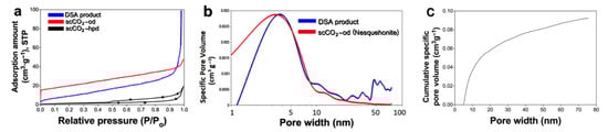 BET isotherms (measured with adsorption of N2 at 77.35 K) are shown in Figure 7a, these results show specific surface areas of 39.1 m2g−1 for the DSA product, 70.4 m2g−1 for the scCO2-od nesquehonite product, and a lower value of 19.8m2g−1 for the scCO2-hpd product. The average pore sizes were 1.02 nm for nesquehonite, 3.78 nm for the DSA product, and 5.48 nm for the scCO2 product dried on a hot plate, according to density functional theory (DFT) modeling (Figure 7b,c) and in both cases the pore size distribution is relatively wide. These results are better than the surface area of carbonate made by reaction with bicarbonate, and that of commercial carbonate, as shown in Table 3. According to the IUPAC classification of adsorption isotherms [,], the scCO2 -hpd carbonate isotherm shows an H3 behavior which is characterized by slit-shaped pores, additionally it behaves as type IV isotherm which corresponds to a micro-mesoporous material with an average pore size of 5.48 nm. We should warn the reader that the heat treatment at 80 °C prior to BET measurements may have altered the hydration state of the carbonates, however this is a necessary step to ensure complete degassing, which otherwise would give inaccurate readings. By using the same pretreatment for the oven-dried and hot-plate dried materials we aimed to make both sets of results comparable.