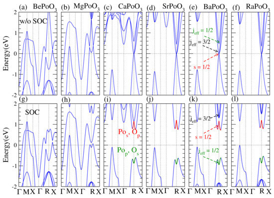 Scalar relativistic band structures, (a–f) upper panel, and fully relativistic band structures, (g–l) bottom panel for APoO perovskite. The Fermi level is shifted to zero as the reference. Without SOC effect, (a) BePoO, (b) MgPoO, (c) CaPoO, (d) SrPoO, (e) BaPoO, and (f) RaPoO are metals while there are Dirac corn-like band appeared at R point. The highest occupied band at R point is singlet s = 1/2 and the lowest two bands are j = 3/2 and 1/2. When the SOC effect is included, (g) BePoO and (h) MgPoO are metals, however (i) CaPoO, (j) SrPoO, (k) BaPoO, and (l) RaPoO are insulators. The metal to insulator transition appears due to the SOC effect and the s = 1/2 and j = 1/2 bands flipped, see (e) and (k).