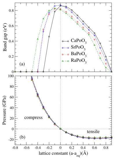 In previous studies of the YBiO perovskite [18,19,41], the topological phase appeared at equilibrium. Halide perovskites such as CsPbI and CsPbBr can transform into TI under very high pressure. To investigate how the bandgap varies with lattice constants, plotted in Figure 3 is the bandgap as a function of its lattice constants, a. The calculated bandgap was the largest at the equilibrium lattice constant for CaPoO and SrPoO, and the bandgap decreases away from the equilibrium lattice constant. For BaPoO and RaPoO, the largest bandgap occurred at smaller lattice constants. We found that the TI phase existed in a wide range of lattice constants, see Figure 4.