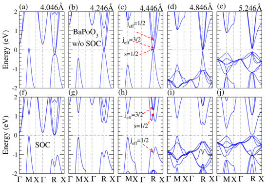 Calculated electronic band structures of BaPoO as a function of the lattice constant without (upper panel) and with (bottom panel) SOC. Lattice constant for (a,f) is 4.046 Å; (b,g) 4.246 Å; (c,h) is 4.446 Å; (d,i) is 4.846 Å; (e,j) is 5.246 Å. The external pressure induced by the change of lattice constant is from 60 GPa to −20 GPa as shown in Figure 3b. The Fermi level is shifted to zero as a reference. Without SOC effect, the BaPoO perovskite is a normal metal and the band contributions at R point near the Fermi level is the same, except (e). When the SOC is taken into account, the band inversion occurs at lattice constant from 4.046 Å to 4.846 Å. The energy for the lowest unoccupied band is decreased when the lattice constant is decreased or increased, which results in a decrease in bandgap.
