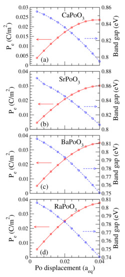 It is fascinating if the cubic perovskites are electrically polarized. Nonetheless, the ideal cubic perovskite has a space inversion structure. Hence the electric polarization, , for all cubic perovskites is zero. However, there were kinds of defects or structural distortions in experiments. These defects or distortions will break the space inversion of the cubic perovskite, which produces a nonzero electric polarization. One way to study the electric polarization is to calculate the induced as a function of the atom’s displacement. Plotted in Figure 5 is the electric polarization as a function of the Po atom’s displacement. This displacement is with respect to its equilibrium lattice constant. For example, the Po atom’s displacements of 0.02 for the CaPoO, SrPoO, BaPoO, and RaPoO were 0.087 (Å), 0.088 (Å), 0.089 (Å), and 0.089 (Å), respectively. The induced electric polarization was large and increased linearly to around 0.02 (C/m) at 0.02 of the Po atom’s displacement. The increased slowly and saturated after the Po atom’s displacement was higher than 0.02. We also found that the calculated bandgap decreased as the Po atom moved away from the center at the TI phase. This behavior was also reported in previous study of the halide CsPbI perovskites [20].