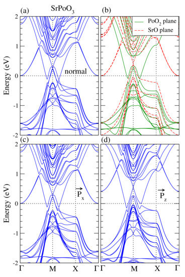 (a) Calculated fully relativistic band structure for the SrPoO supercell. (b) Fully relativistic band structures with PoO surfaces on both sides, green solid-lines, and SrO surfaces on both sides, red-dashed lines. (c,d) Fully relativistic band structures with Po atoms moving in-plane and out-of-plane, respectively.
