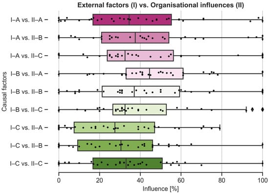 The histograms of the responses broken down into respective stages are presented in Figure 2. The obtained results were then analyzed, so as to remove the outliers (presented as box-plots in Figure 3, Figure 4, Figure 5 and Figure 6). These were identified by multiplying the interquartile range (IQR) by 1.5 within each relationship. The values greater than Q3 + 1.5 × IQR or lesser than Q1 − 1.5 × IQR were discarded. We thereby removed 16 outlying data points (out of the total of 2400 data points, 0.67%). Median values for each relationship between factors (influence) have been calculated as presented in Figure 7. Furthermore, tables provided within Appendix A (Table A1, Table A2, Table A3 and Table A4) depict the statistical analysis of the responses given for each stage, respectively. Median (ME), average (AV), and standard deviation (SD) of the responses for a particular stage are provided in the left upper corner of the respective table.