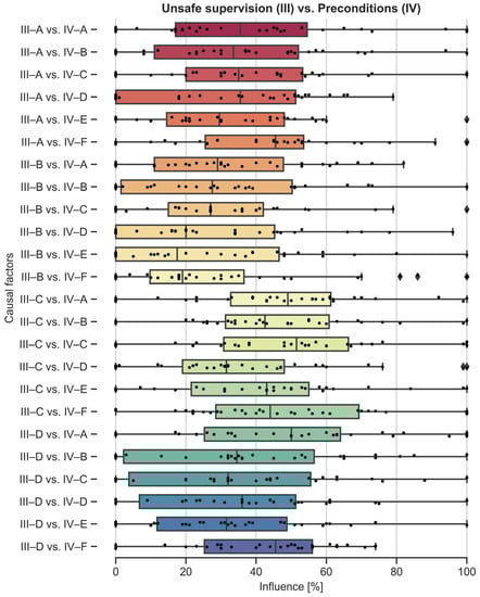 It can also be found that relationships between causal factors in Unsafe supervision and Preconditions (III vs. IV), as well as in Preconditions and Unsafe acts (IV vs. V) stages are generally characterized as either stronger or weaker than those on External factors and Organizational influences (I vs. II) or Organizational influences and Unsafe supervision (II vs. III) stages. It appears that it was somewhat easier for the experts to recognize stronger/weaker relationships on the stages closer to actual operations. The experts agreed with each other the most on the Organizational influences and Unsafe supervision (II vs. III) stage, with SD = 25.64. The overall median of the experts’ responses was also the greatest for this stage (ME = 40.0), which suggests that the experts recognize that a widely-understood organizational environment is important for ensuring safe operations of autonomous vessels, including the human factors present therein. While this issue has been recognized as important by various scholars [8,28,40], it has also been studied to the least extent [41] to date.