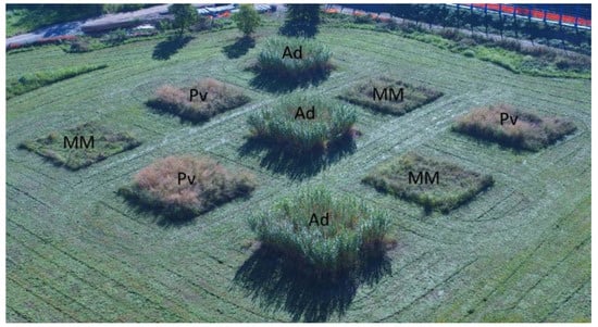Experimental field photographed from the air during the period of this study. The letters represent the different species used: A. donax (Ad); switchgrass (Pv) and mixed meadow (MM). Each block has the dimensions of 10 m × 10 m with a distance of 10 m between the plots. The grass between the plots was regularly mown, to avoid growth of surrounding weeds.