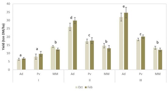 Estimated biomass yield of the treatments, each column representing each harvest operation under the different combination of year (I, II and III), species (Arundo—Ad, switchgrass—Pv and mixed meadows—MM) and harvest times (October and February). Error bars represent SD and letters a, b and c label statistically homogeneous subgroups (p < 0.05).