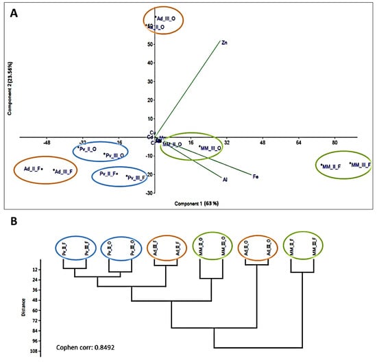 PCA biplot (A) and clustering analysis (B) based on the accumulation of 12 metals (Al, Cr, Mn, Fe, Co, Ni, Cu, Zn, As, Mo, Cd and Pb) in the biomass of A. donax L. (Ad), switchgrass (Pv) and mixed meadow (MM), considering the year of cultivation, second (_II) and third (_III), and the harvest time (October: _O and February: _F). In PCA analysis the first two axes (PC1 and PC2) explain 86.56% of the total variance.