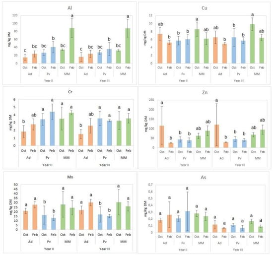 Each sample was divided into three subsamples for technical repetitions. The analyses were performed on digested 300 mg of dry matter (65% HNO3) by a microwave digester system (Anton Paar Multiwave 3000, Austria). Diluted samples were measured by ICP-MS (Varian 820 ICPMS, Agilent, Santa Clara, CA, USA) as reported in [].