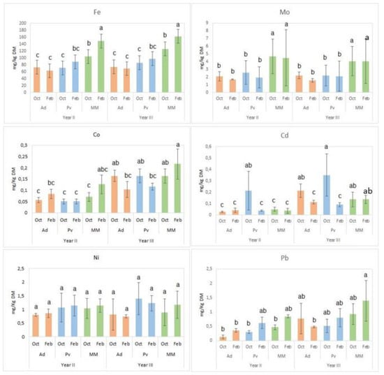 Animal production, in particular pig farms, represents a possible source of heavy metals. In fact, the major input in pig livestock is represented by feed, which should be controlled in order to prevent the excessive spread of heavy metals into the environment [,,]. On the other hand, minerals such as Co, Cu, Fe, Mn, Mo and Zn are important cofactors for various enzymatic activities and consequently should be used to supplement animals’ diet in accordance with the authorized levels [].