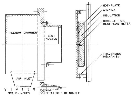 The jet from the slot impacts an aluminum plate, an excellent conductor, so as to suppress the temperature differences on its sides; this plate is heated electrically, while the back and sides are thermally insulated. Its temperature is controlled at 36 [°F] higher than the outlet nozzle temperature, low enough to be able to neglect the radiation heat losses. The convective heat exchange is therefore obtained from the interaction between a cooling air flow and an isothermal hot surface. A transducer mounted on the plate, sliding on the latter, allows the local heat exchange coefficient calculation. The measurements were made for different slot openings, equal to 1/4, 1/8 and 1/16 inch, with a slot length fixed to 6 inches. In addition to the single slot, tests were conducted on rows of slots, arranged in different ways: two slots (placed at a distance of 4 inches) or three slots (separated by 2 inches).