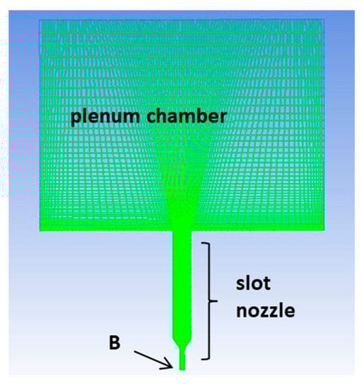 A crucial aspect is the ability to correctly replicate the slot outlet conditions (velocity profile). For this reason, an upstream extension of the computational domain has been adopted (Figure 4); it essentially consists of a plenum. Downstream of it there is a duct, at the top of which a restricted section is mounted to accelerate the flow and to assume the geometry configuration of the slot.