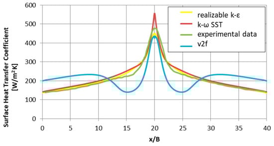 In Figure 6 the convective heat transfer coefficient distributions obtained by the different turbulent models were compared to the experimental values.