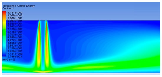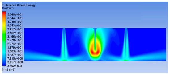 Turbulence kinetic energy contours of the single slot jet at H/B = 8, Re = 1.1 × 104, with k-ε model.
