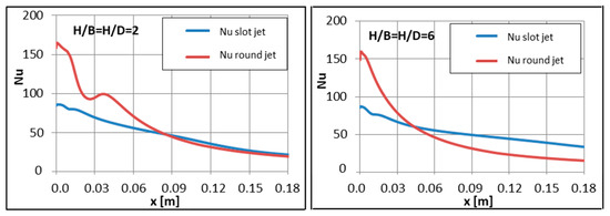 The same settings were used both for the grid and for the numerical models. In the round jet configuration, a circular duct long enough to develop the flow was used to obtain the velocity and turbulence profiles. More details on the circular nozzle were reported in a previous paper [34], which also highlighted the best accuracy of the v2f model for those cases. In Figure 9 the Nusselt number distributions for the two configurations are compared for the jet–wall distances H/B = H/D = 2 (left) and 6 (right); in Table 3 the average Nusselt values and percentage differences are shown.