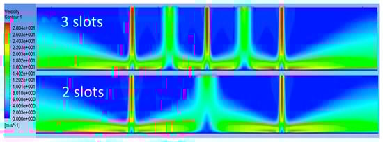 Velocity contours of multi slot jet configuration with H/B = 4, Re = 5500 and realizable k-ε model: three slots (upper) and two slots (down).