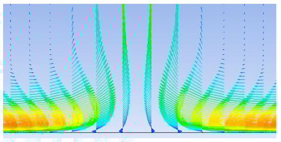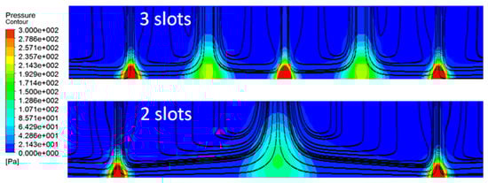 Since the slots are close to the wall, the fluid cannot mix considerably with the surrounding medium, so the jet is well developed in the wall proximity. The single jet physics is therefore kept in this case, but the interaction between the jets is also present and the wall jets meet. Away from the jet axis, the wall velocity decreases inside the wall jet because of the boundary layer development, leading to an unfavorable pressure gradient ∂p/∂x > 0. In the mixing area between the wall jets there is a local pressure increase and the flow tends to curve upwards to leave the upper outlet (where pressure ambient is set).In this regards the pressure contours (with the surface streamlines projected) of the three slots (upper) and two slots (down) configurations are shown in Figure 12, while in Figure 13 the velocity vector in the mixing zone has been reported.