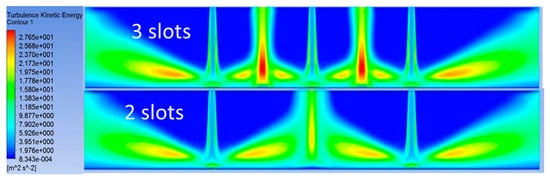 The main differences between the three and two slot configurations concern the distance between the jets; in the two jets it is almost doubled, so the wall jets have more space to reduce their velocity (interacting with the surrounding medium) before their interaction and their mixing. The turbulent kinetic energy contours for the two configurations (Figure 14) highlight these differences for the heat transfer.