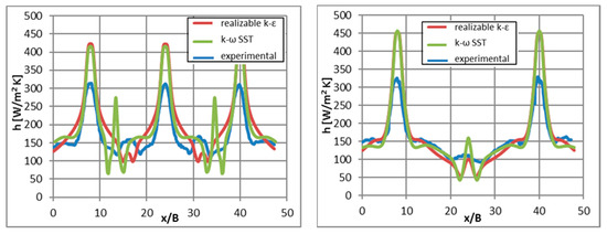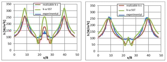 In Figure 15 the convective heat transfer coefficient distributions from the CFD simulations are compared with the experimental data; in Table 5 the average values are reported together with the corresponding percentage error with respect to the experiments.
