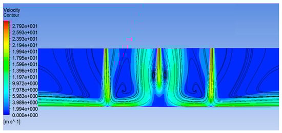 The same analysis has been performed for a configuration with the jets with higher distance from the target wall defined by H/B = 16. Three or two jets have been considered. In Figure 16 the velocity contours and streamlines of the three slots configuration have been reported.