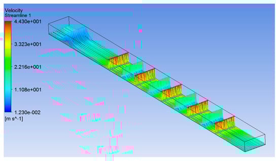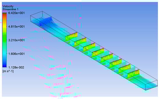 The actual jet cooler geometry was simplified and the domain includes only the fluid flow from the outlet nozzles to the band surface, as well as the solid domain of the band (band half thickness). The above main parameters were chosen in order to make the present configurations comparable to the previous one with round jets [30]. The parameters guarantee the same mass flow rate and similar jet velocity values from the plenum. In the second model the H/B ratio was nevertheless strongly reduced with respect to the reference value [30] to enhance the turbulence generation into the flow field. To decrease H/B, the slot width was increased, with same jet height (a constraint design parameter). The Discrete Ordinates radiation model was activated in the CFD model due to the high band temperature. A mesh of two million elements complies with wall refinement constraints to get a y+ value close to one. The following boundary conditions were set: at the inlet the velocity and turbulence profile obtained in the preliminary simulation on the plenum model (Figure 19) have been set. Due to the band movement, the transverse input surface was modeled by activating the Frame Motion option with a velocity of 180 [m/min] in the appropriate direction. The temperature of 660 [°C] was fixed on this transverse input surface of the band. The band solid domain (with half thickness) is equipped with meshes and the conjugate heat transfer option is considered. The moving wall option with a speed equal to that of the band has been activated for the band upper surface. On the lower band surface a symmetry condition was used to correctly simulate the cooling on both band sides. An outlet relative pressure condition of 150 [Pa] (pressure value controlled in the cooling chamber) was set on the boundaries of flow domain between one slot and the other. The periodicity condition on the lateral surfaces of the band and on the transversal surfaces of the flow is imposed (the model represents only a sector of the complete jet cooler in the middle of the line).